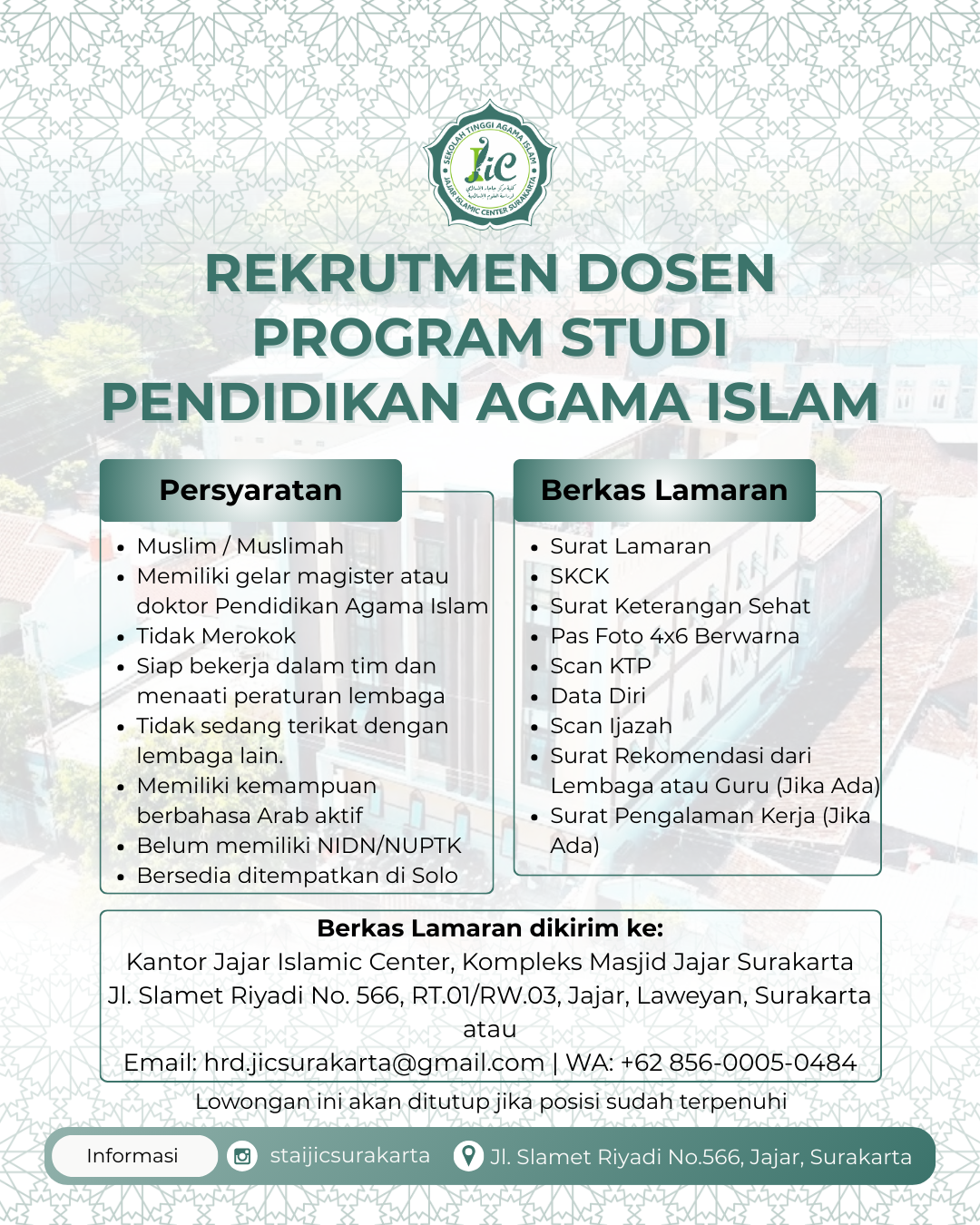 STAI Jajar Islamic Center Surakarta membuka kesempatan kepada para akademisi untuk bergabung sebagai Dosen Program Studi Pendidikan Agama Islam (PAI).